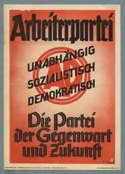 The Workers Party (Socialist Unity Party) (German: Arbeiter-Partei (Sozialistische Einheitspartei)) was a political party in West Germany. The party was founded in Offenbach in the autumn of 1945.[1][2] The party sought to profile itself as a third alternative to the Social Democratic Party of Germany (SPD) or the Communist Party of Germany (KPD).[1] Between 1946 and 1947 the party expanded to other towns in Hessen.[1] The party gathered former members of the Communist Party of Germany (Opposition) (KPO) and the Socialist Workers Party (SAP).[1] Heinrich Glam was the chairman of the party, former chair of the KPD branch of Offenbach and former leader of KPO and SAP.[3] Another key leader was Philipp Pless, party secretary and chair of the Frankfurt branch.[3]