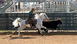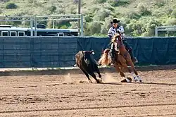 Reined cow horse events which are "open" to all breeds and held by the National Reined Cow Horse Association (NRCHA).[1] Working cow horse events are also held at breed specific shows, such as at an American Quarter Horse Association[2] or Arabian Horse Association show,[3] The general rules between various organizations are usually similar to the NRCHA in that the horse is required to perform two or three different sorts of work in one or two sessions. One session consists of reining work, where a reining pattern is performed.[1] This is often referred to as the "dry work."[4] The other is the cow work, where a single cow is released into the arena and the horse is asked to first hold the cow at one end of the arena (known as "boxing") then run the horse along the rail of the arena, turning it back without the aid of the fence (known as "fencing"). Lastly, the horse maneuvers the cow into the center of the arena and cause the cow to circle in a tight circle in each direction (known as "circling"). All this must be accomplished before the cow is exhausted. In three event competition, a "Herd Work" session is also included. The herd work is similar to cutting where a single cow is "cut" from a herd of cattle and prevented from returning to the herd by the intervention of the horse and rider. Herd work is most often included in three-year-old futurity and four- and five-year-old derby classes. Herd work is also included in a "Bridle Spectacular" class.[4][5] (The Arabian Horse Association omits the reining work in its breed shows.[3]) The horse is judged on the ability to control the cow, as well as speed, balance, responsiveness to the rider.[4]