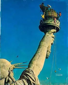 Working on the Statue of Liberty, also known as Statue of Liberty, is a 1946 oil painting by American illustrator Norman Rockwell, showing workmen cleaning the torch held aloft by the Statue of Liberty (Liberty Enlightening the World) in New York Harbor.[1]