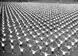 The World Gymnaestrada is the largest general gymnastics exhibition. Much like the Olympics, the event is held every four years. However, the focus of this event is not on winning medals but instead Group Performances – some with hundreds or even thousands of participants.[1] Adults and children of every age and description perform. Countries from around the world come together to showcase their talent and the culture of their various countries. The choreography is designed both to challenge the participants and to delight audiences. Routines are performed at various venues within the host country. Large group routines are known as "mass routines" which involve hundreds of gymnasts. The mass routines are often performed in large stadiums where spectators can take in routines performed by gymnasts from all over the world.