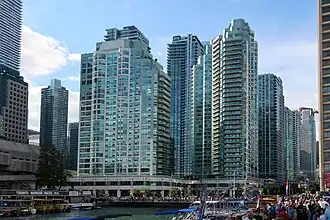 The Residences of the World Trade Centre is a postmodern complex near the Harbourfront in Toronto, Ontario, Canada. Built in 1990, the taller of two buildings rises to 38 floors in height. The Residences of the World Trade Centre is a 700-unit condominium complex, with retail at ground level.