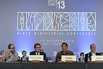 The Ninth World Trade Organization Ministerial Conference was held in Bali, Indonesia from 3 to 7 December 2013.[1] The conference was chaired by the Indonesian Trade Minister Gita Wirjawan.[2]