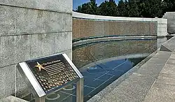 On May 23, 2013, Senator Rob Portman introduced the World War II Memorial Prayer Act of 2013 (Pub. L. 113–123 (text) (PDF)), which would direct the Secretary of the Interior to install at the World War II memorial a suitable plaque or an inscription with the words that President Franklin D. Roosevelt prayed with the United States on June 6, 1944, the morning of D-Day.[37] The bill was opposed by the American Civil Liberties Union, the American Jewish Committee, Americans United for Separation of Church and State, the Hindu American Foundation, and the Interfaith Alliance.[38] Together the organizations argued that the bill "endorses the false notion that all veterans will be honored by a war memorial that includes a prayer proponents characterize as reflecting our country's 'Christian heritage and values.'"[38] The organizations argued that "the memorial, as it currently stands, appropriately honors those who served and encompasses the entirety of the war" and was carefully created, so no additional elements, such as FDR's prayer, need to be added.[38] But, they said, "the effect of this bill, however, is to co-opt religion for political purposes, which harms the beliefs of everyone."[38] The bill was signed into law on June 30, 2014,[39] and the Commission of Fine Arts preferred a design at the Circle of Remembrance to the northwest of the memorial.[40] With funding secured, it was initially intended to be dedicated on June 6, 2022,[41] but was instead opened a year later on June 6, 2023 on the 79th anniversary of the Normandy landings.[42]