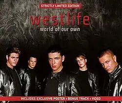 "World of Our Own" is a song by Irish boy band Westlife. It was released on 18 February 2002 as the second single from their third studio album of the same name (2001). The song peaked at number one on the UK Singles Chart,[1] becoming their 10th number-one single. "World of Our Own" was the 40th-best-selling single of 2002 in the UK and received a platinum sales certification from the British Phonographic Industry (BPI) for over 600,000 sales and streams. It is the band's fourth-most-streamed song and 12th-best-selling single in both paid-for and combined sales in the United Kingdom as of January 2019.[2]