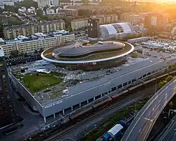 The structure includes exhibition halls, event spaces, and a central staircase with integrated seating that leads to an upper level containing a restaurant, bar, and conference facilities. The circular roof, partially covered with vegetation, is accessible to visitors.[12] The building's foundation work was challenging as the site, previously occupied by Saab’s gearbox factory,[19] consisted of water-saturated clay. Excavation involved removing 60,000 cubic meters of clay.[20]