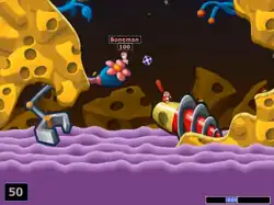 Worms 2 is a turn-based tactical game. Players take turns controlling teams of worms across two-dimensional landscapes. Worms are randomly placed across the landscape at the start of each level.[4] During a single turn, a player can move only one of their team's worms. Worms can crawl and jump,[5] as well as swing by ninja-rope, parachute, teleport, and bungee[2] when the appropriate items are available.[4] The objective of a traditional match or campaign mission is to defeat all opposing teams by killing their worms and become the last surviving team.[4] When hit with a weapon, a worm will lose health depending on the power of the weapon and the directness of the hit.[6] A worm can be killed either by having its health reduced to zero or being knocked into the water around and below the level.[4] Should a specified amount of time in a round pass and there still be multiple hostile teams alive, sudden death is enabled, during which either or both of these events occur: the landscape sinks under water, or each worm is reduced to one unit of health. If sudden death is disallowed, the round simply draws.[7]