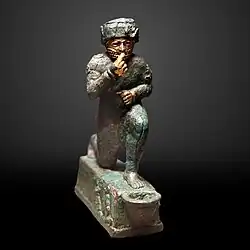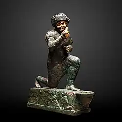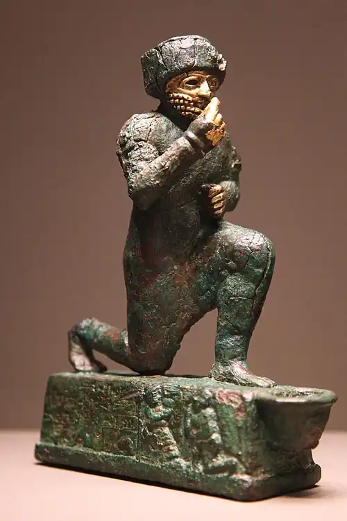 The Worshipper of Larsa is a Mesopotamian statuette on display in Room 227 at the Louvre Museum, of the paleo-Babylonian era (2004-1595 BCE). It depicts a bearded man, kneeling and performing a ritual gesture with his hand to his mouth. The statuette was dedicated to the god Amurru by an inhabitant of Larsa, in order to safeguard the life of King Hammurabi (reigned c. 1792 BC-1750 BC).