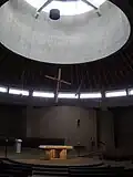 The abbey church (one part of the larger Worth Abbey complex of buildings) was built between the years 1964 to 1974 by the renowned English architect Francis Pollen who also designed adjoining buildings. It was dedicated to "Our Lady, Help of Christians", consecrated for worship in 1975, and is today a Grade II listed building of 17,000 square feet seating around 900 people. Being built for a monastic community to pray the communal Liturgy of the Hours, as well as a parish church for the local community, required a creative design. The original construction of a "church in the round" with a stone altar in the centre was considered common for that post Vatican II era, but unique in the architectural construction of churches in the larger UK. A general lack of funding delayed the construction and also required many original design features to be abandoned.[7]