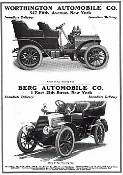 In 1904 Horseless Age Magazine reported that the leaders of the Worthington Automobile Company, had purchased the rights and property of the Berg Automobile Company. The Berg company would retain its name. The Worthington company would sell the 18-horsepower Berg under the name of the Meteor. A new garage was being built between West 49th and 50th streets. Charles C. Worthington was president of the company and H. Rossiter Worthington was secretary and treasurer.[4] In August 1904 the Worthington Automobile Company entered their Meteor and Berg cars in the Long Branch, New Jersey, automobile races, and in the five-mile pick up race finished first and second.[5]
