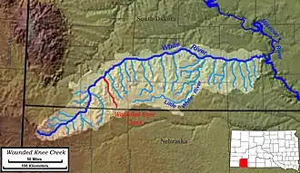 The creek rises in the southwestern corner of the Pine Ridge Indian Reservation, along the state line with Nebraska, and flows northwest. It borders the site of the 1890 Wounded Knee Massacre, in which United States Army troops from the 7th Cavalry Regiment massacred approximately 300 Lakota people, most of whom were unarmed women and children.[3][4] Towns in this region include Wounded Knee and Manderson. The Wounded Knee Creek flows NNW across the reservation and joins the White south of Badlands National Park.