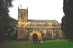 Wragby's parish church, situated in the grounds of Nostell Priory and not in the village, is the grade I listed Church of St Michael and Our Lady.[3] The church was built in the 1520s-1530s, and contains some earlier Romanesque fragments,[4] and a collection of Swiss stained glass, dating from the early-16th to mid-18th centuries, which has been described as "second largest private collection of Swiss glass panels in the world".[5] A weekly parish eucharist service is held,[6] and the church is in use for weddings.[7]