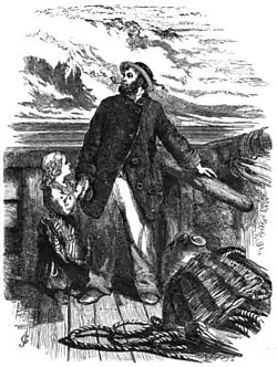 "The Wreck of the Hesperus" is a narrative poem by American poet Henry Wadsworth Longfellow, first published in Ballads and Other Poems in 1842.[1] It is a story that presents the tragic consequences of a skipper's pride. On an ill-fated voyage in winter, he brings his daughter aboard ship for company. The skipper ignores the advice of one of his experienced men, who fears that a hurricane is approaching. When the storm arrives, the skipper ties his daughter to the mast to prevent her from being swept overboard. She calls out to her dying father as she hears the surf beating on the shore, then prays to Christ to calm the seas. The ship crashes onto the reef of Norman's Woe and sinks; the next morning a horrified fisherman finds the daughter's body, still tied to the mast and drifting in the surf. The poem ends with a prayer that all be spared such a fate "on the reef of Norman's Woe."