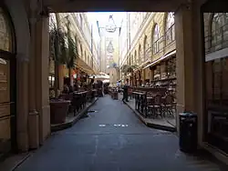 Among architects, the entity is known as the Wrede passage, but its official Finnish name has been Vanha kauppakuja ("Old merchant passage") since a naming competition held in 1958.[1]: 66 The name is spelled Wanha kauppakuja on top of the entrance.[2] The passage itself is colloquially known as the "Grandma tunnel". It has terraces of several restaurants, which are said to be popular among middle-aged guests. The restaurants are maintained by Center-Inn, which was bought by HOK-Elanto in 2013.[3]