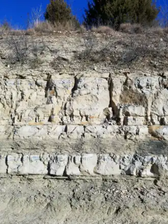 ![]() The flinty Threemile Limestone Member of the Wreford Limestone Formation in Manhattan, Kansas. | |