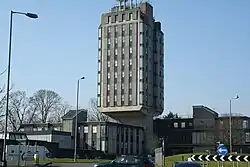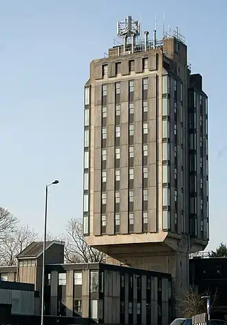 The station was built in the Brutalist architecture style between 1973 and 1975. It was designed by Eric Langford Lewis, the county architect, and Stuart Brown, the assistant county architect.[1] The building was ten-storeys,[2] and built with an re-enforced concrete frame clad containing pre-cast corrugated concrete panels. The building's defining aspect was its cantilevered tower which emerged from the building's central stalk. The tower was 142 feet (43 m) tall, and contained the main offices, briefing and interview rooms, and the Special Branch's highly specialised accommodation.[3] When opened, the tower became Wrexham's tallest building, overtaking the tower of St Giles' Church.[4] The building served as the divisional headquarters of North Wales Police until replaced by a facility in Llay, as well as Wrexham's police station, since replaced by a smaller one near Wrexham library.[1]