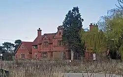 The farmhouse is built in brick with stone dressings and has two storeys plus attics. The entrance front faces south and has three bays. The central bay projects forwards and includes a doorway with a single-light window on each side. The other bays, on the ground floor, and all bays in the upper storey, have five-light mullioned windows. All three bays are surmounted by Dutch gables with ball finials. The gables in the lateral bays each contain a small two-light window; the central bay has an oval window. The west face of the farmhouse also has two Dutch gables and stone mullioned windows. The other two faces are plain. A covered passage links the house to the farm buildings. Together with the farmhouse, the farm buildings form a quadrangle. The buildings are in one and two storeys, built in brick, and have steep roofs. The entrance arch has a half-timbered upper storey. In the northeast corner of the farmyard is a dovecote surmounted by a spire.[1][2] In 1888 Douglas submitted his design for this building and for Saighton Lane Farm at the Royal Academy.[4] The authors of the Buildings of England express the opinion that this is "one of the most agreeable of all Douglas' model farms".[5]