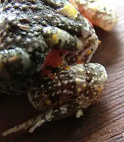 The wrinkled toadlet is a small frog, which varies largely in size. It is smaller on the coast of eastern Australia, and larger inland, ranging from 1.8 to 3.2 cm (0.71 to 1.26 in). The dorsal surface is warty, and grey to brown, with dark markings. The ventral surface is smooth and grey. The parotoid glands and inguinal glands are large in comparison to the size of the frog, and yellowish in colour. Behind each knee, and in the groin are bright orange.