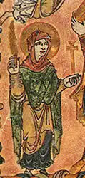 Women wearing a sleeveless overgarment, with or without hood, can be seen in artistic representations of this time period. Women in late Anglo-Saxon art are depicted wearing hooded garments: either a scarf wrapped around the head and neck or an unconnected head covering with an opening for the face. It was assumed that the hooded style was influenced by Near Eastern art.[28] Women are shown wearing ankle-length, tailored gowns. Gowns are often depicted with a distinct border, sometimes in a contrasting colour. In the tenth century, women's arms are typically covered. Sleeves are seen as straight, with a slight flair at the end. Braided or embroidered borders often decorated sleeves. By the eleventh century, multiple sleeve styles had come into fashion.[29]