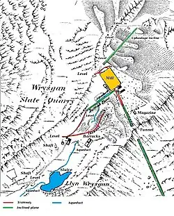 Power to drive the mills was provided by waterwheels, supplied from a small reservoir, Llyn y Wrysgan, situated to the south of the main quarry buildings. The reservoir was filled by a leat, but the water supply was often inadequate.[5] When the site was auctioned in 1869, its assets were stated to include "two powerful water wheels and a steam engine."[6] At some point, a steam engine was installed to power the lower mill, and another was used to raise slates from levels opened up below the level of the mill. Steam engines proved to be costly to run, and the company tried to negotiate use of the unused Cross Mill at Cwmorthin quarry. When the negotiations failed, they replaced the mill engine with a 50 hp (37 kW) producer gas engine, and a water balance was used to raise slate from the lower levels to the mill. A car engine was subsequently used to power this incline.[1] The main incline was also problematical, as the boiler was undersized for the steam engine. The works were electrified in the 1920s, after which a novel solution to the problems of the main incline was introduced. Whenever empty wagons needed to ascend the incline, the main motor from the mill was borrowed and connected to the haulage drum. Later still, a lorry engine was used to power the incline.[1] Because of the intermittent working of the quarry, the incline was lifted in 1913, and was relaid in 1923 by the New Wrysgan Slate Quarry Ltd. A new siding was built at the foot of the incline, and the Board of Trade inspected the works on 7 October 1926. Track was again removed from the incline some time in the 1930s, and it was reinstated as a single track incline in 1940 by its new owner, T. O. Williams. It worked in this form until the quarry closed for good in 1946, on the death of Williams.[7]