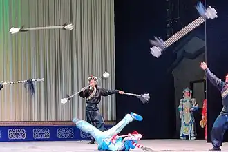 In addition to singing, wudan actresses must also be trained in martial arts, gymnastics, and acrobatics, just like their male counterparts (wusheng). A unique skill for the wudan actress is "kicking the spears" (Chinese: 打出手; pinyin: dǎchūshǒu; lit. 'beat out-of hand') which is unused in wusheng roles. In such a combat scene the wudan is in the middle of the stage surrounded by her enemies, each holding a couple of light double-headed spears with tassels at each ends. The enemies toss their spears for the heroine to kick back in various ways, which is meant to mimic deflections in battles. The result is fast-paced action (if the actress is good) with many spears flying through air simultaneously.[6]