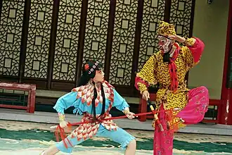 The changkao wudan (simplified Chinese: 长靠武旦; traditional Chinese: 長靠武旦; pinyin: chángkào wǔdàn; lit. 'long-armor wudan'), better known as the daomadan (simplified Chinese: 刀马旦; traditional Chinese: 刀馬旦; pinyin: dāomǎdàn; lit. 'blade-horse female'), is a woman, often an army commander, who fights on horseback in battles. Popular daomadan characters include Mu Guiying from the Generals of the Yang Family and Hu Sanniang from the Water Margin. In Peking opera, the daomadan wears a long "female armor" (女靠, nükào), which is similar to that worn by their male counterparts but with flower and phoenix embroidery as well as multicolored streamers hanging from the waist.[3] The armor is usually in red or pink. The armor restricts movement, so the daomadan is less acrobatic compared to the duanda wudan. For more freedom a "reformed armor" (改良靠, găiliángkào), which lacks the four flags in the back and fits more closely to the body, can be worn.[4] Her helmet is attached to two lingzi (long pheasant feathers). The commonly used weapon is a long-poled dao (blade) or qiang (spear).[5]