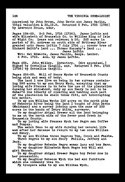 - ^ published by The Virginia Genealogist, undetaed Brunswick County Deeds and Wills, pages 126-127, https://brouwergenealogy.blogspot.com/2018/10/the-wyche-family-of-virginia.html