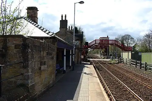 The over-line, elevated signal box, once a popular design for the line is now almost unique, with the only other surviving signal box of this design located at Hexham.[6] Constructed in 1835, the stationmaster's house is a Grade II* listed building,[7] whilst the footbridge and signal box are both Grade II listed.[8][9]