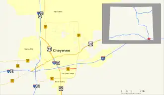 Wyoming Highway 221 traveled from I-25 Business/US 85/US 87 Business (South Greeley Highway) to Wyoming Highway 212 (College Avenue). Highway 221 paralleled Interstate 80 about one-half mile south of the Interstate and served residential and commercial areas.[2][3] The route was decommissioned in 2009; all state route marker signs have been removed, and the route no longer appears on the Wyoming Official State Highway Map.[2]