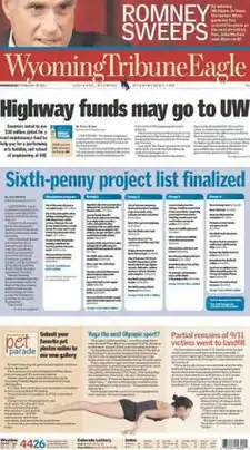 ![]() The February 29, 2012 front page of the Wyoming Tribune Eagle | |