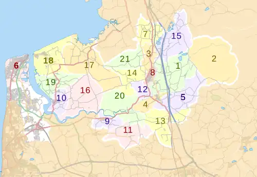 Much of the borough is covered by civil parishes. The parish councils for Fleetwood, Garstang and Preesall have declared their parishes to be towns, allowing them to take the style "town council".[21] The former urban districts of Poulton-le-Fylde and Thornton-Cleveleys form an unparished area.[10]