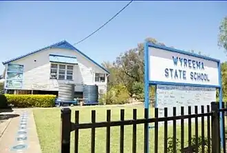 Wyreema State School is a government primary (Prep-6) school for boys and girls at 12 High Street (27°39′31″S 151°51′18″E / 27.6586°S 151.8550°E).[15][16] In 2018, the school had an enrolment of 160 students with 14 teachers (10 full-time equivalent) and 9 non-teaching staff (5 full-time equivalent).[17]