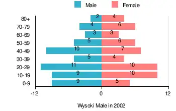 According to the 2002 Poland census, there were 113 people residing in Wysoki Małe village, of whom 51.3% were male and 48.7% were female. In the village, the population was spread out, with 27.4% under the age of 18, 36.3% from 18 to 44, 17.7% from 45 to 64, and 18.6% who were 65 years of age or older.[1]