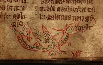 A wyvern from a fourteenth-century manuscript in the National Library of Wales, Aberystwyth: this example has a second head at the end of its tail.