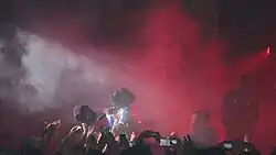 M.I.A. performed "XXXO" at the Sound Academy in Toronto in late 2009. On the red carpet to the Spike TV 2010 Scream Awards she wore the "XXXO Burka", a black burka – a traditional Islamic garment – printed with lyrics, the graphic "XO I Love You" inside a heart and artwork to the song and album, and revealing teal eye shadow, studded stilettos and yellow nail polish.[17] The singer went with a different ensemble for her onstage performance later in the night, sporting a blue-turquoise wig, yellow sequined blouse, pink pants and green shoes to sing "Teqkilla."[18] Time magazine placed the "XXXO Burka" at number two on its list of the "Top Ten Fashion Statements of 2010", stating "there was a sharp intake of breath when singer M.I.A. turned up at an awards event this year in one of the most controversial garments of our era: a burqa. For many, it's a symbol of oppression, representing the systematic silencing of female voices. For others, it's a symbol of liberation, freeing the women who wear it from oversexualization or objectification of the female form. Either way, at least we know it's versatile" before concluding that it was difficult to be offended by the friendly piece.[19]