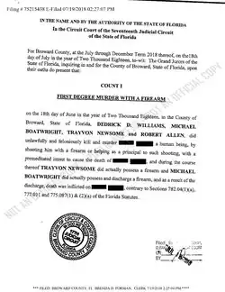 Two days after the murder of Jahseh Onfroy, a.k.a. XXXTentacion, 22-year-old Dedrick Devonshay Williams was arrested on June 20, 2018, in connection with the killing. He was charged with dangerous and depraved first-degree murder, robbery with a firearm, and operating a vehicle without a valid driver's license. Three arrests followed in the coming months; 22-year-old Robert Allen, 22-year old Michael Boatwright, and 20-year old Trayvon Newsome were arrested and charged with premeditated first-degree murder and robbery with a firearm. All were later indicted by a grand jury on premeditated murder.[7][8]