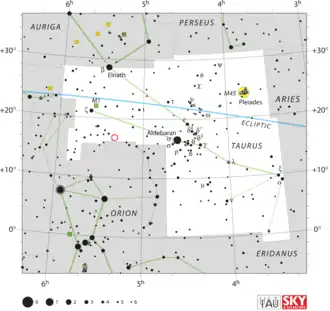 XX Tauri (Nova Tauri 1927) was a nova, which appeared in the constellation Taurus in 1927. It was discovered by Arnold Schwassmann and Arno Arthur Wachmann at Hamburg Observatory on an objective prism photographic plate taken on 18 November 1927. Subsequent examination of pre-discovery photographic plates taken at the Harvard College Observatory showed that the peak brightness, magnitude 5.9, occurred on 1 October 1927, at which point it may have been faintly visible to the naked eye.[5] By 1988 it had faded below magnitude 19.8.[6]