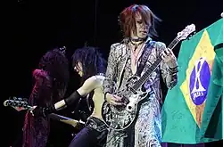 X Japan is considered one of the founders of visual kei, a movement among Japanese musicians comparable to Western glam, with the name itself believed to have been derived from their slogan "Psychedelic Violence Crime of Visual Shock".[22][190] In 2011, Yoshiki briefly described their early years and the movement's development, saying "when we started the band, the problem was we didn't belong anywhere. Because we were playing very heavy music, we were wearing tons of make-up and crazy outfits. So we couldn't belong anywhere", "[We did our own thing and] that eventually became visual kei."[191] He added, "But visual kei is more like a spirit, it's not a music style or, you know... I think it is a freedom about describing myself, a freedom to express myself."[191] Upon former guitarist Hide's death in 1998, less than a year after the band broke up, Billboard's Steve McClure declared it "the end of an era", explaining "X was the first generation of visual kei bands[...] For the next generation of bands, it's like: That's it. The torch has been passed to us."[22]