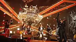 On January 20, 2008, two Tokyo Dome concert dates were announced for March 28 and March 30.[55][56] Due to popular demand, they added another concert for the 29th.[57] These three shows were entitled X Japan Resume Attack 2008 I.V. – Towards Destruction, with each individual concert titled Night of Destruction, Night of Madness and Night of Creation, respectively, and featured three guest guitarists filling in for the late Hide – Wes Borland, Richard Fortus and Sugizo.[54][58] The March 28 concert was aired live on the pay-per-view channel WOWOW.[59][60][61][62] During the song "Art of Life" a hologram of Hide (taken from footage of the "Art of Life" performance at the Tokyo Dome in 1993) played alongside the band.[3][63] Because of technical difficulties, possibly due to the hologram, the first concert was delayed for over two hours and later came to an abrupt end when drummer Yoshiki collapsed eight songs into the performance.[3][63] The subsequent shows were without such difficulties, and during a press conference, plans for a concert in Paris on July 5, 2008, were announced, with an intended audience of 20,000 people.[60][61] In addition to the Paris date, plans for concerts at the Madison Square Garden in New York City on September 13, and at the Taipei World Trade Center in Taipei on August 2 were also announced.[64][65]