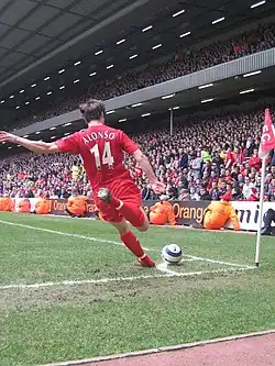 Despite the events of the summer, Alonso made a confident start to the season and both his peers and the press praised his strength of character, citing his influence as a factor in the team's strong opening to the season.[71][72] Alonso's importance to the team was further underlined when he scored the only goal, through a deflection, in a 0–1 victory against Chelsea, making Liverpool the first away team to win at Stamford Bridge in over four years.[73] Statistical analysis reflected Alonso's good form: on 11 December, figures from Opta Sports revealed that he was the first Premier League player to complete 1,000 successful passes in the season.[74] His last goal for Liverpool came in their 1–3 away win at Hull City on 25 April, striking after his free kick deflected off the Hull wall.[75]