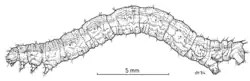 The caterpillar is dark brown on its upper side and light brown below, When fully grown it is approximately 2.5 cm long.[9]