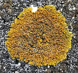 The etymology of the current name is rooted in its appearance and habitat. Xanthoria derives from the Greek xănthós, meaning 'yellow', with the generic suffix oria ("pertaining to"), and alludes to the lichen's bright orange-yellow color.[29] The species epithet parietina comes from Latin parietina ('of walls'), referring to its frequent occurrence on walls. Thus, the name Xanthoria parietina essentially means "yellow wall (lichen)", a fitting description of this common orange lichen, and one of its several English common names.[30] Other common names used for this species include "common orange lichen", "yellow scales",[31] "maritime sunburst lichen", "wall lichen",[32] and "shore lichen".[33][34]