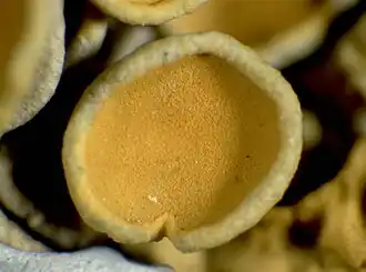 The vegetative body of the lichen, the thallus, is foliose (leafy) and typically less than 8 centimetres (3.1 in) wide. The lobes of the thallus are 1–4 mm (rarely up to 7 mm) in diameter, and flattened,[35] though in African populations the lobes tend to be smaller than those in temperate areas, typically 0.5–2.0 mm wide.[36] The upper surface is some shade of yellow, orange, or greenish yellow, becoming almost green when growing in shaded situations. The lower surface is white, has a cortex, and sparse pale rhizines or hapters that help attach the thallus to its substrate. The vegetative reproductive structures soredia and isidia are absent in this species.[35] X. parietina reproduces primarily through sexual reproduction via apothecia (fruiting bodies). Apothecia typically develop about 2–4 mm behind the growing edge of the thallus and take 12–18 months to reach maturity. Mature apothecia typically measure between 1.5 and 2.6 mm in diameter, though in rare cases they can reach up to 4.3 mm. They can comprise between 0–87% of a thallus's dry weight, with most thalli dedicating 10–30% of their biomass to these reproductive structures. The apothecia can release spores at rates of up to 50 per minute under humid conditions. The production of apothecia appears to be independent of the thallus's directional aspect (north, south, east, or west facing), meaning that sunlight exposure does not significantly influence reproductive effort.[37]
