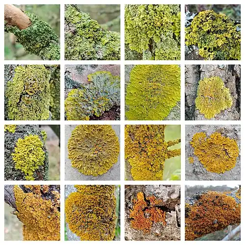 The photosynthetic partners, or photobionts, of X. parietina belong to the green algal genus Trebouxia, including Trebouxia arboricola and T. irregularis. These algae also exist independently in nature, occurring on both lichen-colonized and lichen-free bark.[41] A study found that the photobiont occupies 7% of the thallus volume in X. parietina.[42] Pigmentation density in the upper cortex varies, regulating light exposure to the algae. The Trebouxia photobiont adjusts its photosynthetic activity seasonally, supporting X. parietina in sunlit environments. As sunlight increases in spring, the photobiont reduces chlorophyll levels and produces protective pigments to dissipate excess light as heat. Chlorophyll concentrations are lowest in spring and peak in winter, balancing light absorption and photoprotection throughout the year.[43]