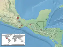 There are five major population areas for the Xenosaurus grandis in Southern Mexico and Guatemala: central Veracruz, southern Oaxaca, north-central Oaxaca, the highlands of central Chiapas, and central Guatemala.[1] The separate population areas have given rise to five subspecies of X. grandis. The five subspecies are X. g. grandis, X. g. agrenon, X. g. arboreus, X. g. rackhami, and X. g. sanmartinesis.[2]