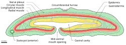 Xenoturbella monstrosa is 20 cm (7.9 in) in length, with a purple or pale pink colouration. The body wall displays several furrows: on the circumference, on the side, and two deep, longitudinal, dorsal ones. The longitudinal orientation involves a rounded anterior end in front of the ring furrow, while the posterior end gradually reduces in thickness. The mouth is orientated ventrally, halfway between the anterior end and the ring furrow. The live specimens exhibited an epidermal ventral glandular network branching over two-thirds of the ventral surface. Gametes are present dorsally and ventrally in the body wall.[1] Tissues contain exogenous DNA corresponding to bivalve mollusks, the vesicomyid Archivesica diagonalis and Calyptogena pacifica.[1]