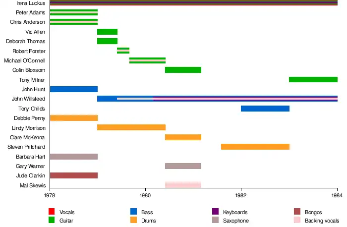 - Irena Luckus – vocals, keyboard, guitar (1978–84)