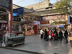 The Xi'an Muslim Quarter (Chinese: 西安回民街) is a snack and commercial street situated in the center part of Xi'an, China. It is close to the Bell Tower and the Drum Tower. Shehui Road is to the east, Zaoci Lane to the west, West Avenue to the south, and Hongfu Street to the north.[1] There are ten mosques in the area. The biggest one is the Great Mosque, which was listed as the state-level protected heritage for its traditional buildings and religious significance.[2] According to demographic statistics in 2010, about 60,000 people live in this area, more than half of which are the Huis and the others are the majority Hans.[3] In the past few decades, Xi'an Muslim Quarter has become a well-known tourism site which is famous for its culture and food. It attracts visitors from all over the world each year.