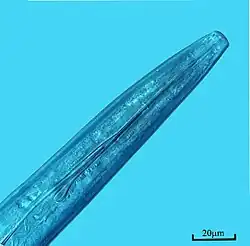 Xiphinema are large nematodes, with an adult length between 1.5mm – 5.0mm.[1] They have a long protrusible odontostyle, with 3 basal flanges at the posterior end of the stylet and a relatively posterior guiding ring when compared to the genus Longidorus.[3] The odontostyle is lined with cuticle and alongside the esophagus serves as a good surface for viruses such as arabis mosaic virus to form a monolayer, which can be vectored to healthy plants.[4] Xiphinema have a two-part esophagus, which does not contain a metacorpus. A modification in the posterior end of the esophagus forms a muscular posterior bulb, which can generate a pumping action similar to that of a metacorpus in other plant parasitic nematodes.[4] The number of males varies from abundant to sparse depending on the species.[1] Males have paired spicules but the gubernaculum and bursa are absent. Males of different species can be characterized using the varying number and arrangement of papillae.[3] Females have 1 or 2 ovaries.[3]