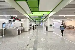 On the station hall floor of this station, there is a mural "Elegant Interest in Xiying" designed by Xiang Yu, a graduate student of the Sculpture Department of the Central Academy of Fine Arts. Through the use of traditional Chinese cultural elements such as classical furniture and Penjing, it reproduces the peaceful and elegant life of the ancient Beijing literati.[3]