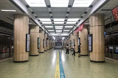 Xizhimen station[1] (simplified Chinese: 西直门站; traditional Chinese: 西直門站; pinyin: Xīzhímén zhàn) is an interchange station for Line 2, Line 4 and Line 13 of the Beijing Subway. Just outside this station is Beijing North railway station.[2] Line 2 opened on September 20, 1984; Line 13 opened on January 28, 2003; and Line 4 opened on September 28, 2009. With the addition of Line 13 and Line 4, Xizhi Men Station became the second 3-way transfer station (the first was Dongzhimen Station, being the intersection of Line 2, Line 13, and Airport Express). With a peak daily ridership of over 770,000 passengers,[3] Xizhi Men Station is also one of the most crowded stations of the whole Beijing Subway system. It sees over 170,000 transfers per day between the 3 lines serving the station.[4]